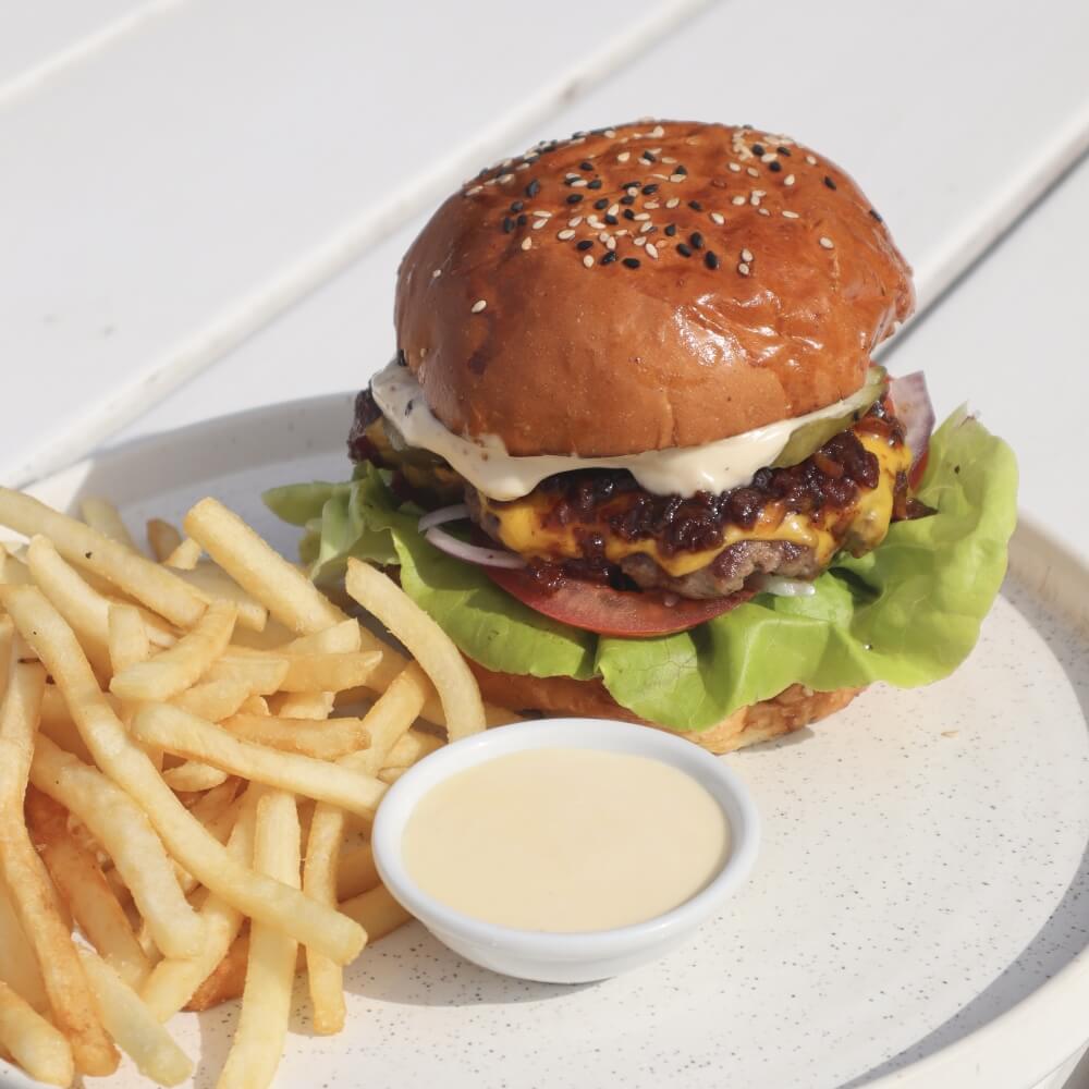 SMASHED WAGYU PATTIE, BAROSSA BACON, BUTTER LETTUCE, TOMATO, ONION, HOUSE PICKLES, BURGER CHEESE, TOMATO SAUCE, MUSTARD, SPECIAL SPICY BURGER SAUCE, MILK BUN, FRIES