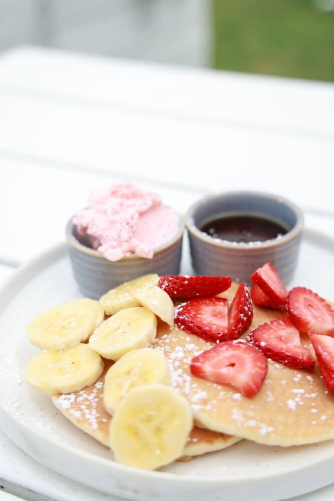 WITH MAPLE SYRUP, STRAWBERRIES, BANANA, STRAWBERRY ICE CREAM
