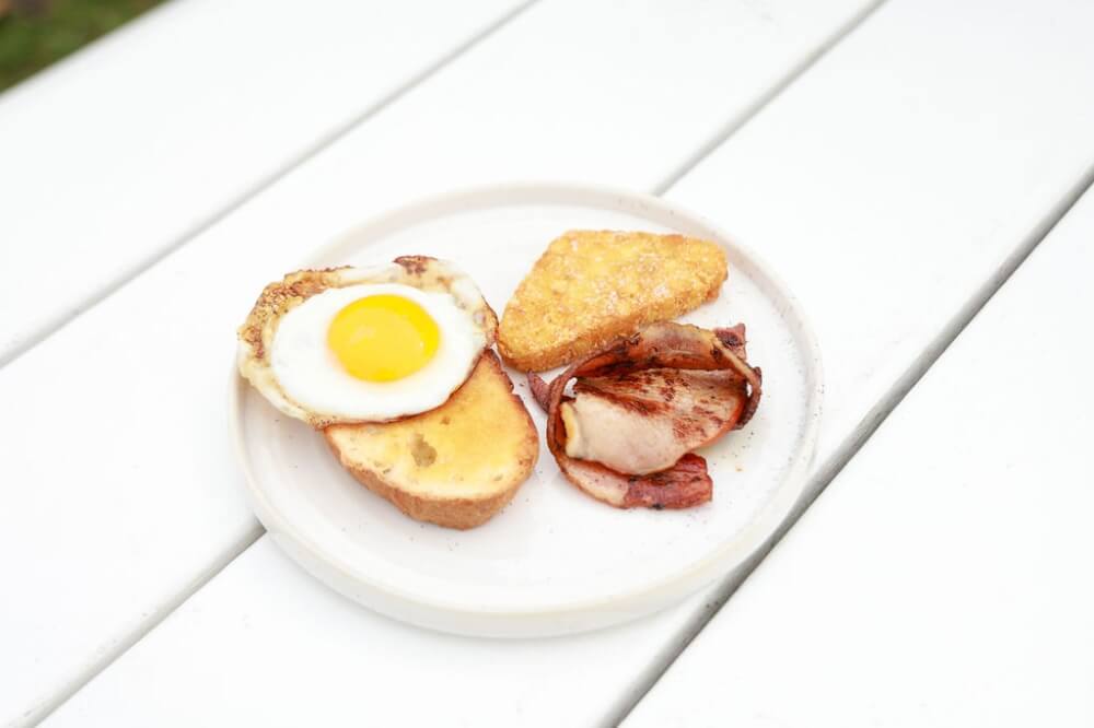 FRIED EGG, BACON, HASHBROWN ON TOAST