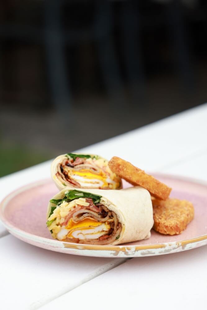 FRIED EGGS, BAROSSA BACON, TOMATO, CHEESE, SPINACH, SMOKEY BBQ AIOLI W/ HASHBROWNS