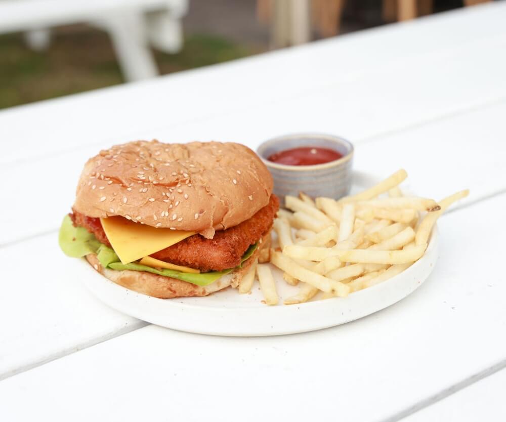 CRUMBED CHICKEN FILLET, SAUCE, CHEESE, LETTUCE, FRIES